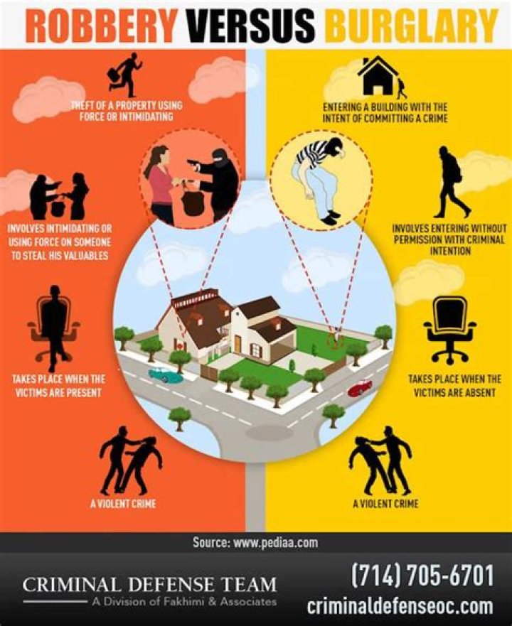 Robbery and burglary are related but different crimes. Robbery occurs when a person takes someone else's property by force or fear. Burglary is entering a structure with the intent to steal or to commit another crime inside of the structure. ... Theft is a separate and distinct crime from both robbery and burglary.
