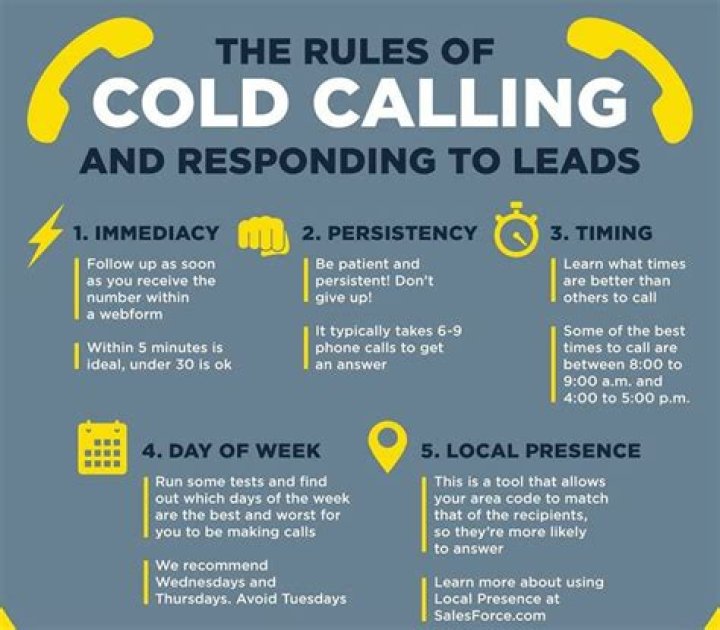 In order to keep it legal, cold callers have to say who they are and why they are calling right away. Within the first two minutes of connecting, the callers must share their name, the name of the company they are representing, the purpose for their call--and their address or phone number if it is requested. 3.