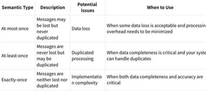 At most once — This is “best effort” delivery semantics. Consumers will receive and process messages exactly once or not at all. At least once — Consumers will receive and process every message, but they may process the same message more than once.