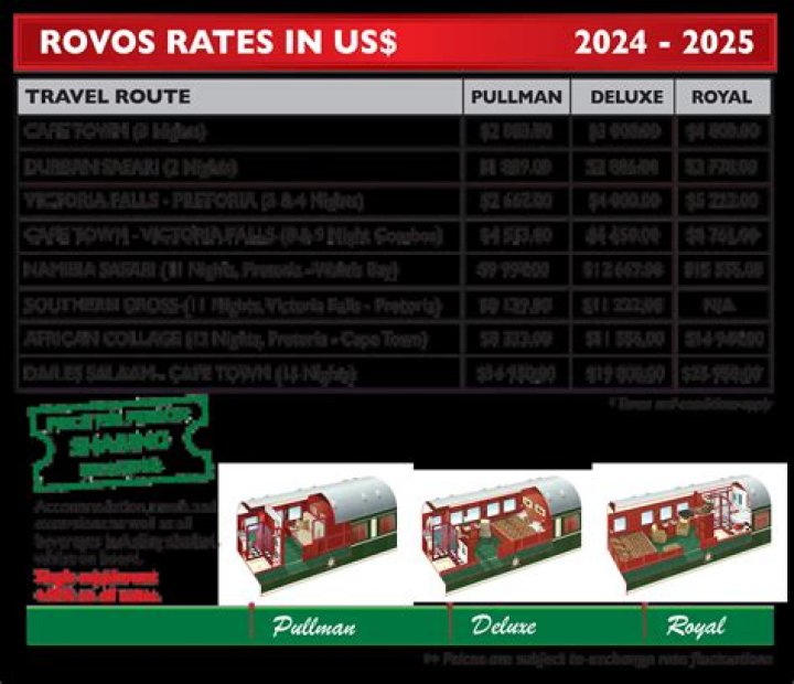 RATE INCLUDES Accommodation on a one-way journey between Pretoria and Victoria Falls or Pretoria and Cape Town; all meals and all alcoholic and other beverages on board; room service and bar facilities; limited laundry service; guided excursions; entrance fees as per itinerary and government tax.