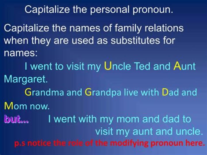 Capitalize family relationship titles when they are used with names or in place of names. Do not capitalize them if they do not replace the name. Aunt Denise, Uncle Jerry, Grandfather Joe.