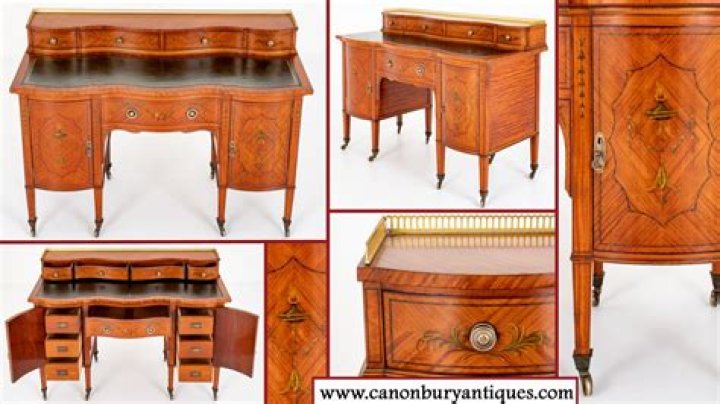 Sheraton's furniture style, like Hepplewhite's, is also characterized by contrasting veneers and inlays. ... Sheraton pieces usually have straight legs although they can be tapered at times. They are often rounded (another distinction from Hepplewhite) and frequently reeded, in imitation of classical columns.