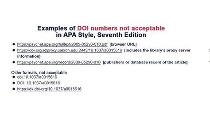 DOIs figure prominently in the APA 7th edition referencing style, and where a book, journal, report or other publication has a DOI, it must be included in the reference. DOIs must always be presented in the format for e.g.