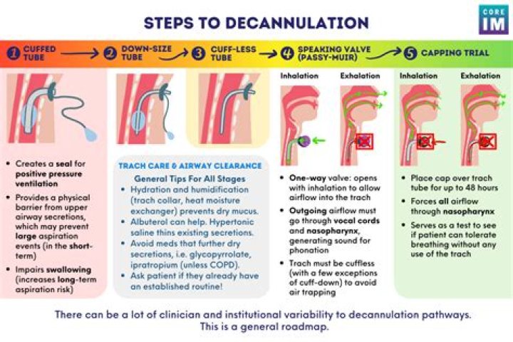 Decannulation may be performed when the patient can tolerate plugging of the tracheostomy tube overnight while asleep without oxygen desaturation. After the tube is removed, the skin edges are taped shut, the patient is encouraged to occlude the defect while speaking or coughing. The wound should heal within 5-7 days.