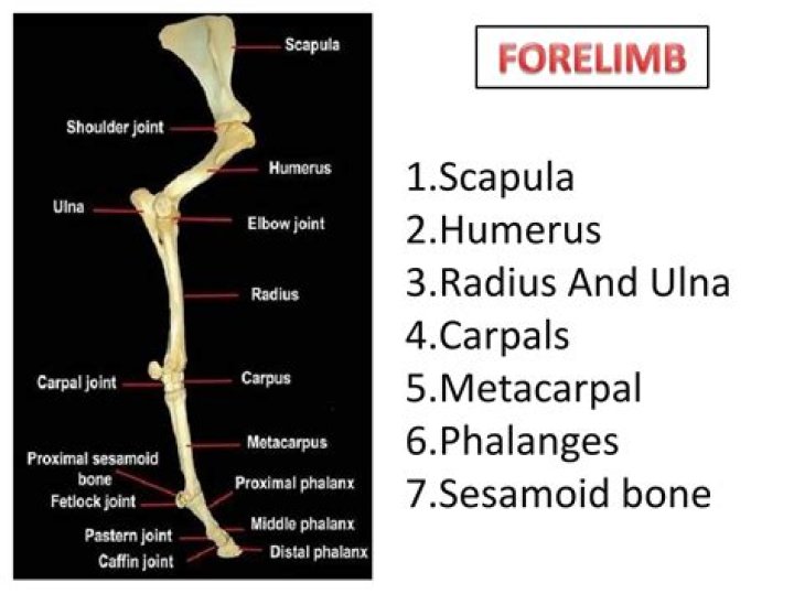The forelimb consists of the humerus, radius, ulna, carpals, metacarpals and phalanges. It moves against or articulates with the scapula at the shoulder joint.