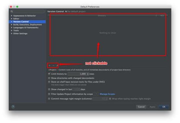 - The Version Control page shows a list of project directories and version control systems associated with them (if no directories have been added, the list only contains the project root).