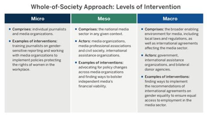Social work theory generally places such interactions into three levels of intervention; micro, meso and macro.
