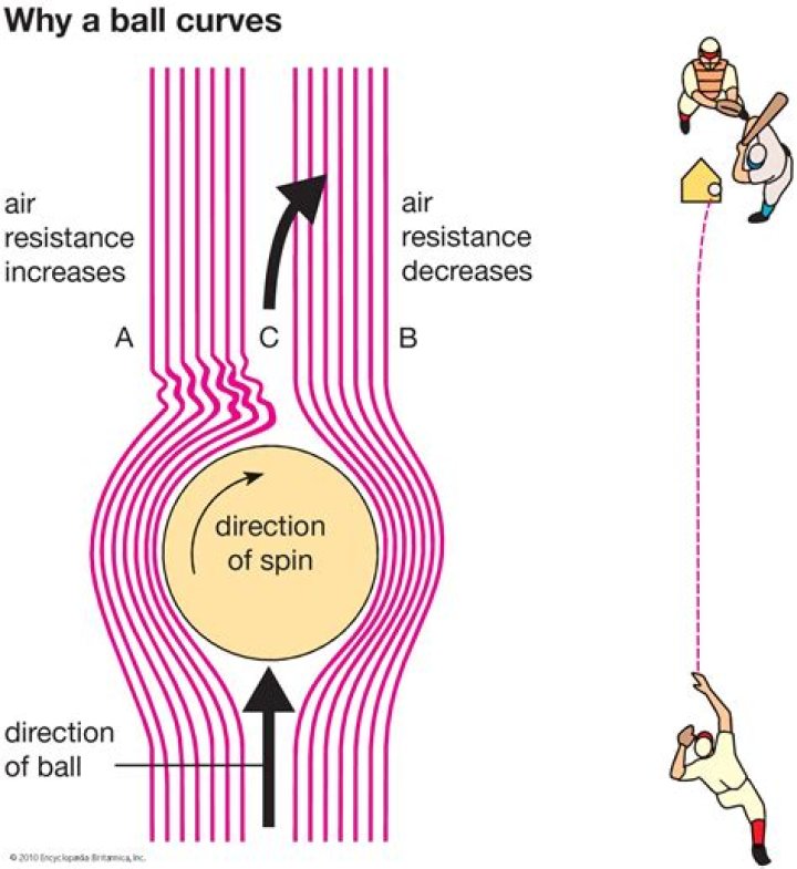 Curveballs, velocity and pressure The friction between the spinning ball and the air causes the air molecules on the right side of the ball to move backwards. ... If a ball is thrown with a counter-clockwise spin, it will curve towards the left. If it's thrown with a downward spin, then the ball will curve downwards.