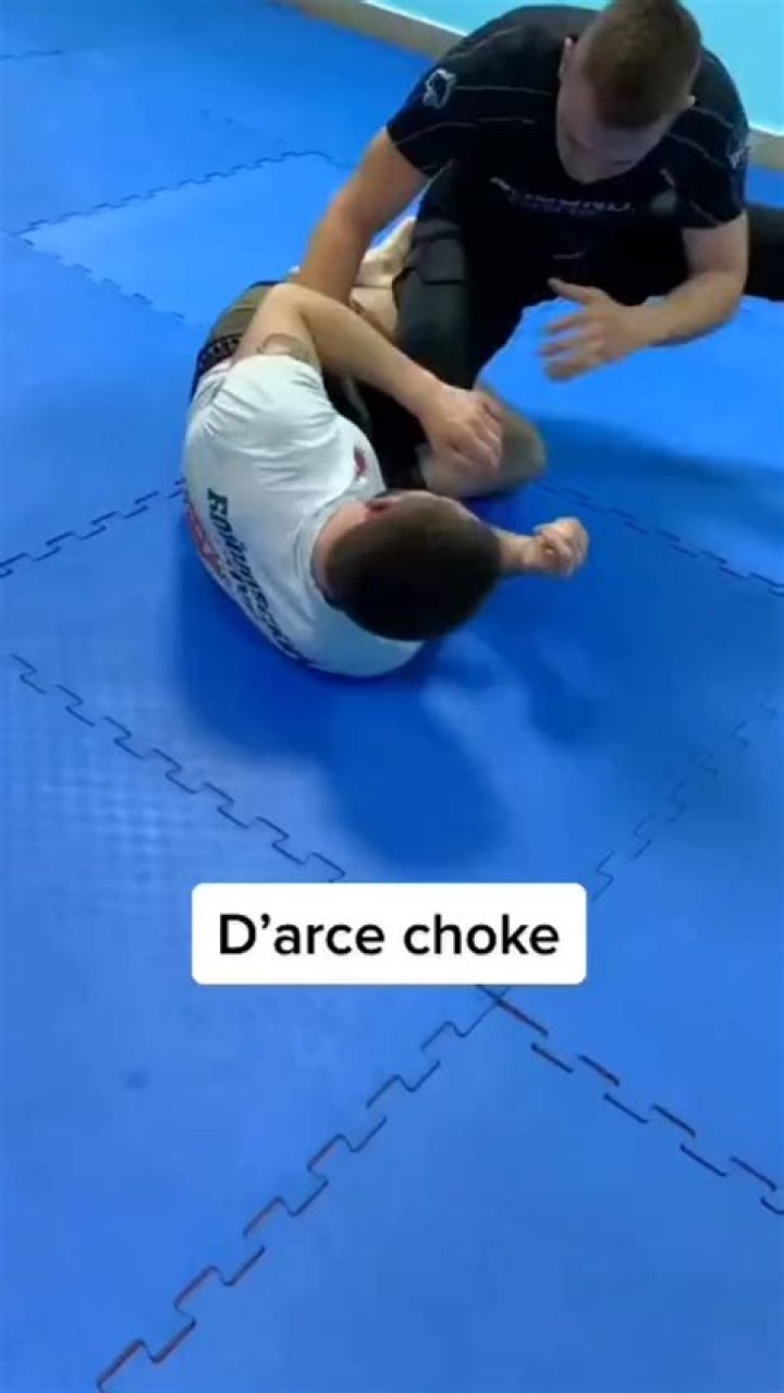 The d'arce choke works using a mix of your force and your opponent's own body against them. Much like an arm triangle, where you push the opponent's arm into their neck to choke them. While at the same time you arm cuts off blood flow to the other side of their neck.