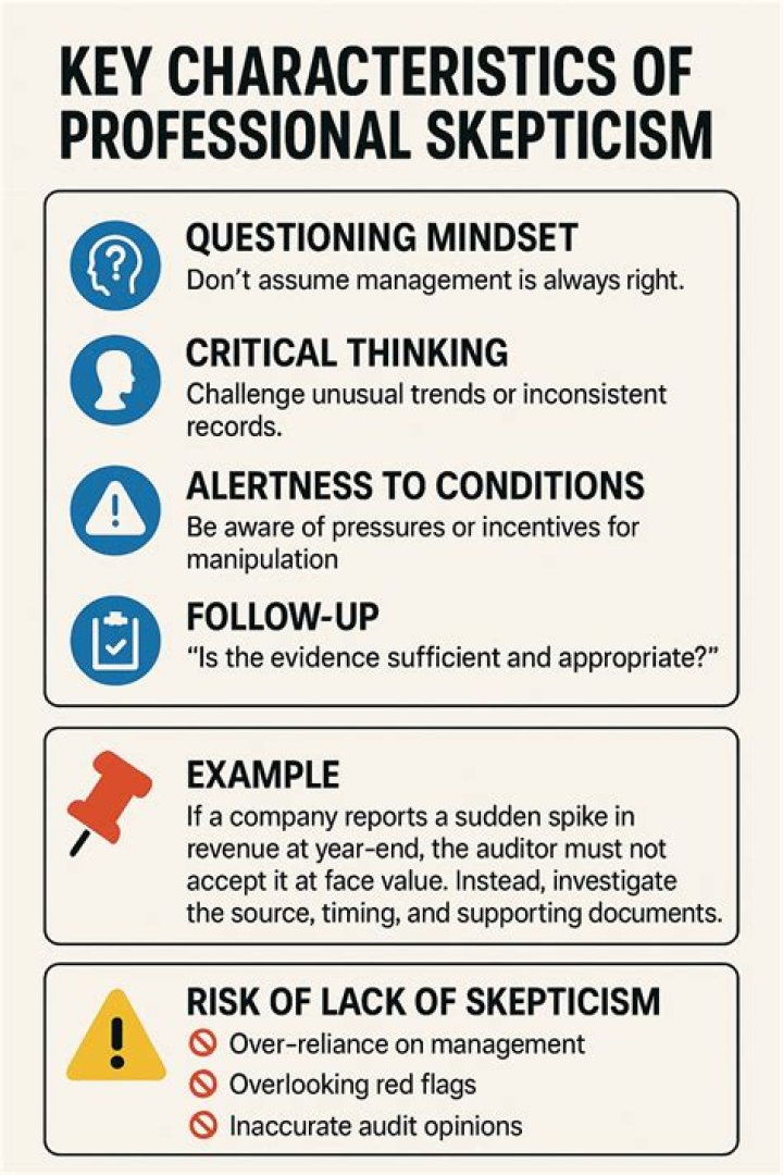 In layman's terms it is a mindset where an auditor does not simply accept information or audit evidence at face value. ... Regulatory bodies have suggested that auditors' enhanced professional skepticism will contribute significantly to improving the quality of audits and that firms should prioritize efforts in this area.