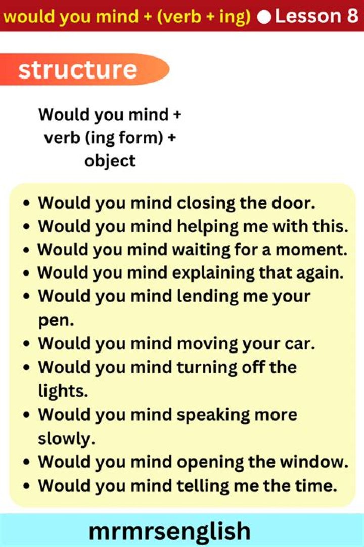 If you want to sound particularly polite, or if you think the answer may be negative, you can also use Would you mind + verb-ing as the preferred alternative to Could you…? Would you mind…? literally means: Would you object to…? Would you mind locking the door when you leave? ~ No, not at all!